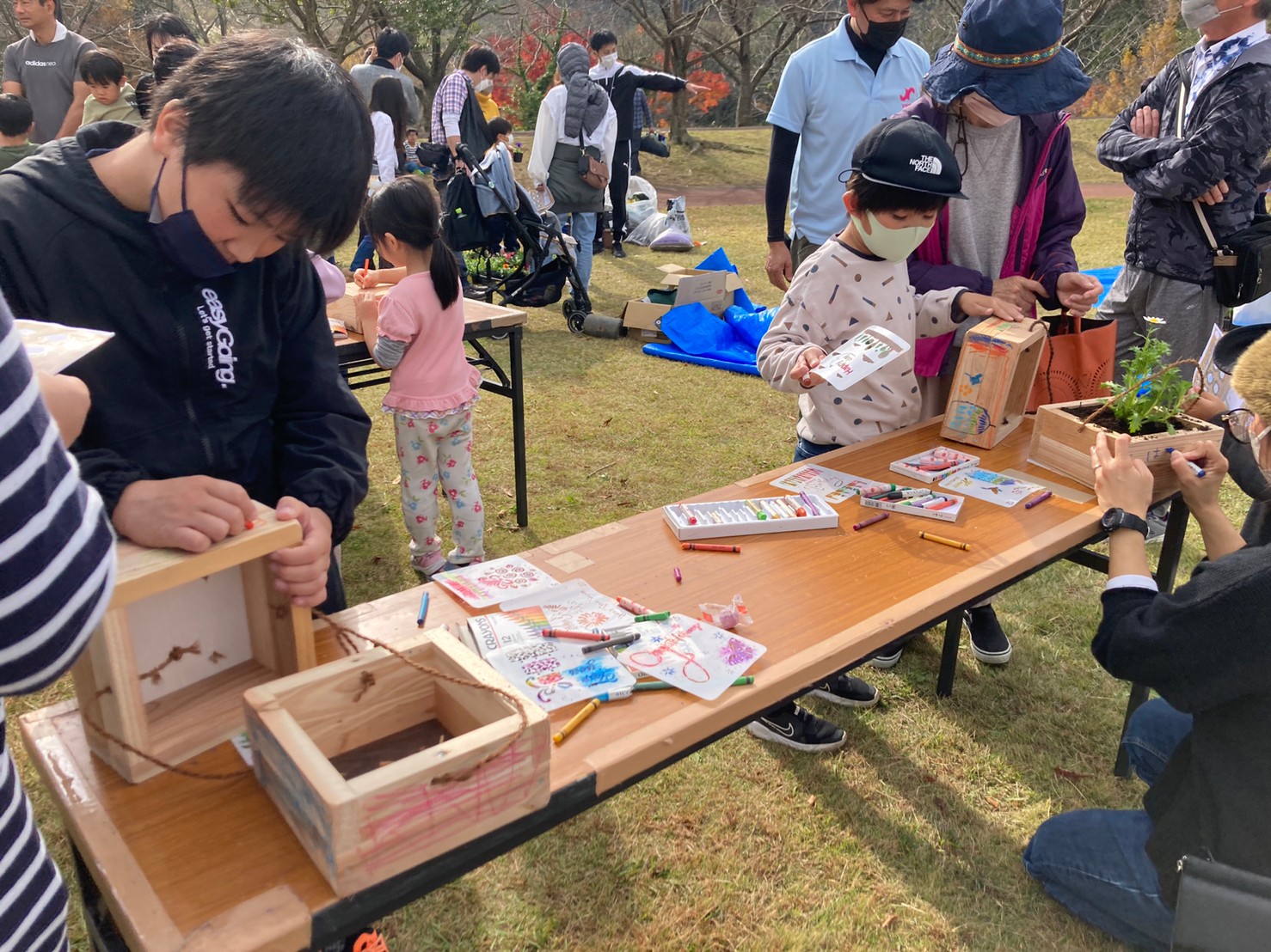 ・一人一花エコプランターアート 建築端材の木材やペットボトルを再利用しエコプランターを作成。来場者に装飾や花苗植栽を楽しく体験してもらいました。