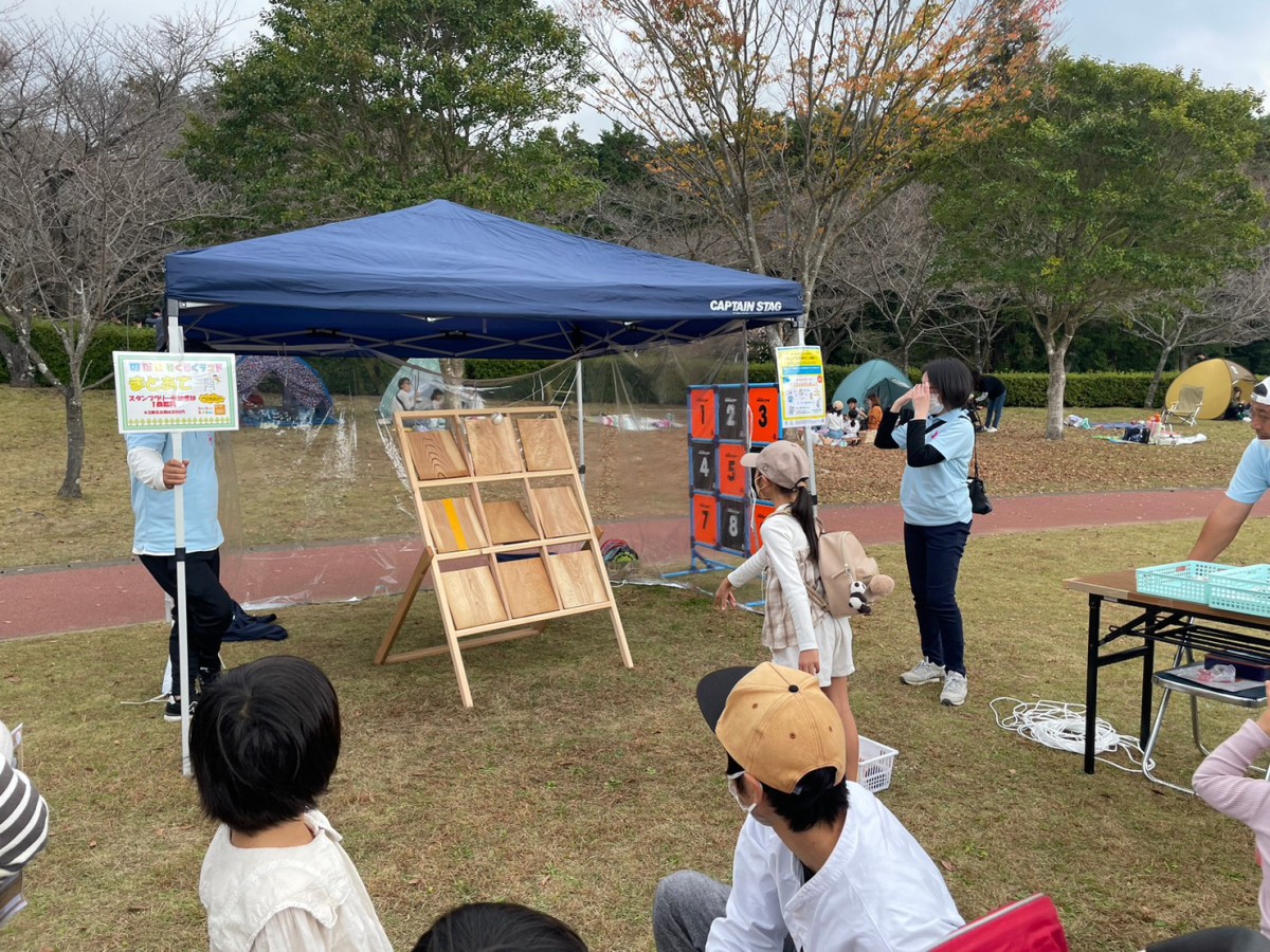 ・わくわくブース 会員事業所や各協力団体に協力していただき、子ども達が自然の中で楽しく遊べるブースの出店。その中の一つのストラックアウトは、建築端材の木材で作成。