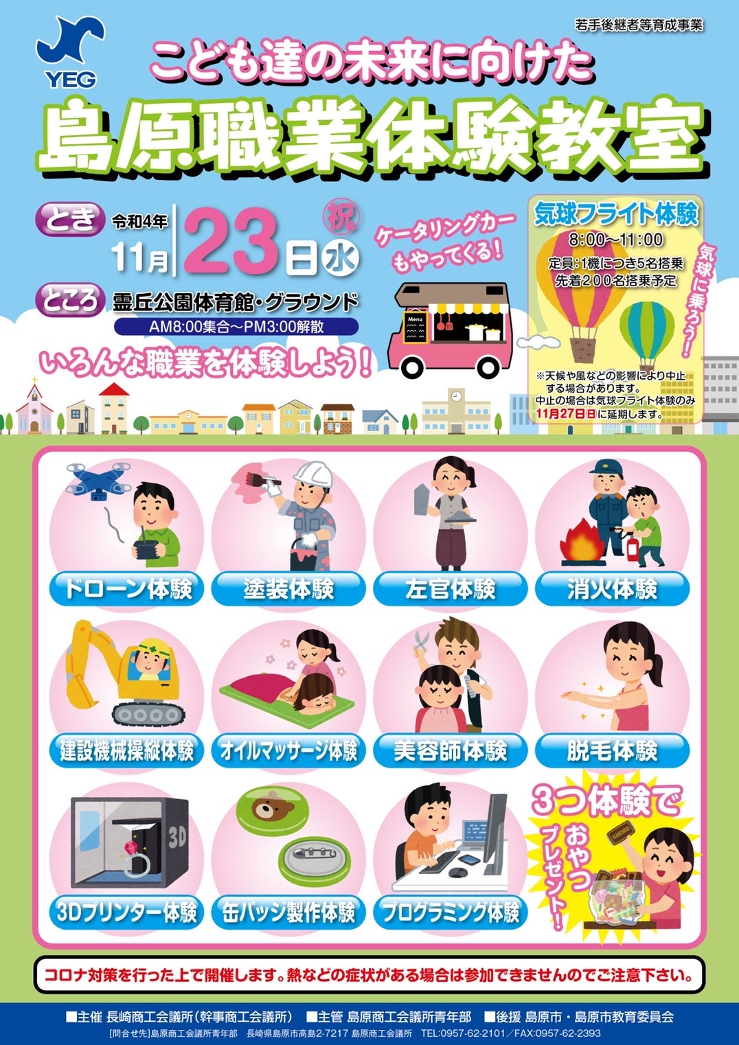 開催目的・内容:将来を担う子どもたちに身近な仕事への興味関心を深めてもらうとともに郷土愛を育んでもらおうと、島原YEG(松本龍亮会長、48人)は11月23日、島原市内の小学4~6年生の児童を対象とする初の職業体験イベント「こども達の未来に向けた島原職業体験教室」を市霊丘公園体育館・弓道場で開いた。市内の児童ら約230人が参加した。 教室では、島原YEGの会員事業所を中心に島原半島内の多様な11業種を体験できるブースを設置。子どもたちは事前申込時に希望した3つの業種を中心に、ドローン操縦や消火器を使った消火体験、バックホウの操縦体験、オイルハンドマッサージ体験、マネキンを使ってヘアアレンジに挑戦する美容師体験などを楽しんだ。このほか、体育館駐車場ではパトカーの試乗体験会なども行われた。 同日に霊丘公園グラウンドで開催予定だった「気球フライト体験」(搭乗無料)は、天候不良により11月27日に延期して行われ、島原市内の児童や保護者など約130人が巨大気球2機に乗り込み、上空からひと味違った故郷の景色を楽しんだ。 松本会長(44)は「『若い世代の地元離れ』や『人手不足』という喫緊の課題解決に向け、まずは地元にどのような仕事があるかを知ってもらい、様々な体験を通して島原を好きに、そして将来的には地元で活躍する人を増やしたいという思いから、青年経済団体である我々商工会議所青年部ならではのイベントとして企画した。当初の予想来場者を超す賑わいと体験を楽しむ子どもたちの姿に、改めてこの事業をやって良かったと感じている。今後も地元島原を盛り上げる活動に尽力していきたい」と力を込めた。