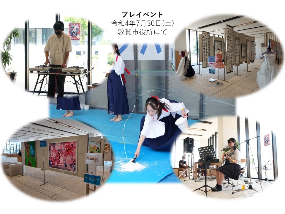 【プレイベントの開催】令和4年7月30日(土)13:00~15:30に、プレイベントとして、敦賀市役所1階オープンスペースおよびデッキスペースにて、書道パフォーマンス(8m×2mの紙に「敦賀市高校生合同文化祭TonTeen2022」の文字を書き、本祭の看板に)、ステージ発表(3組)を行いました。 同時開催で、生徒たちによる作品展示(美術部・書道部・生活情報科ドレス作品・建築システム科作品)を行いました。 プレイベント当日の様子はYouTubeにて配信 https://www.youtube.com/watch?v=CeU9UmWPJjY&t=3s