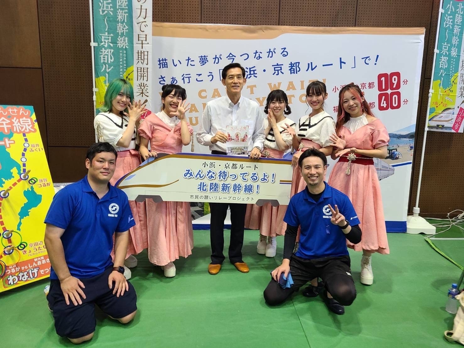・市役所の新幹線・交通まちづくり課の方と協力し北陸新幹線福井・敦賀開業PRブース を設置して、新幹線輪投げを無料で子供たちに遊んでいただきました。また、新幹線パネルの前で写真撮影を行い、缶バッチを無料でプレゼントしました。