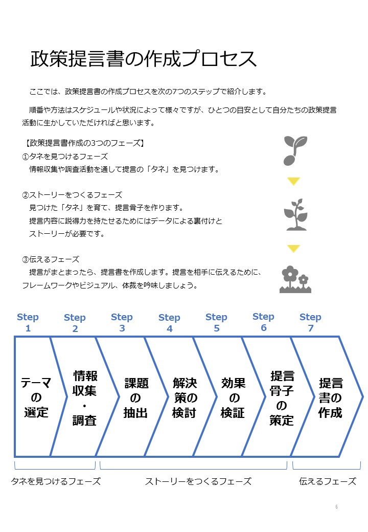 標準化した政策提言作成マニュアルを誰でも利用・再編集できる形式で提供することで、地域性・時代背景・組織特性・年度スケジュールなど、政策提言に取組む組織の背景に応じて、政策提言作成マニュアルが発展・マッチングできるよう企画しました。
