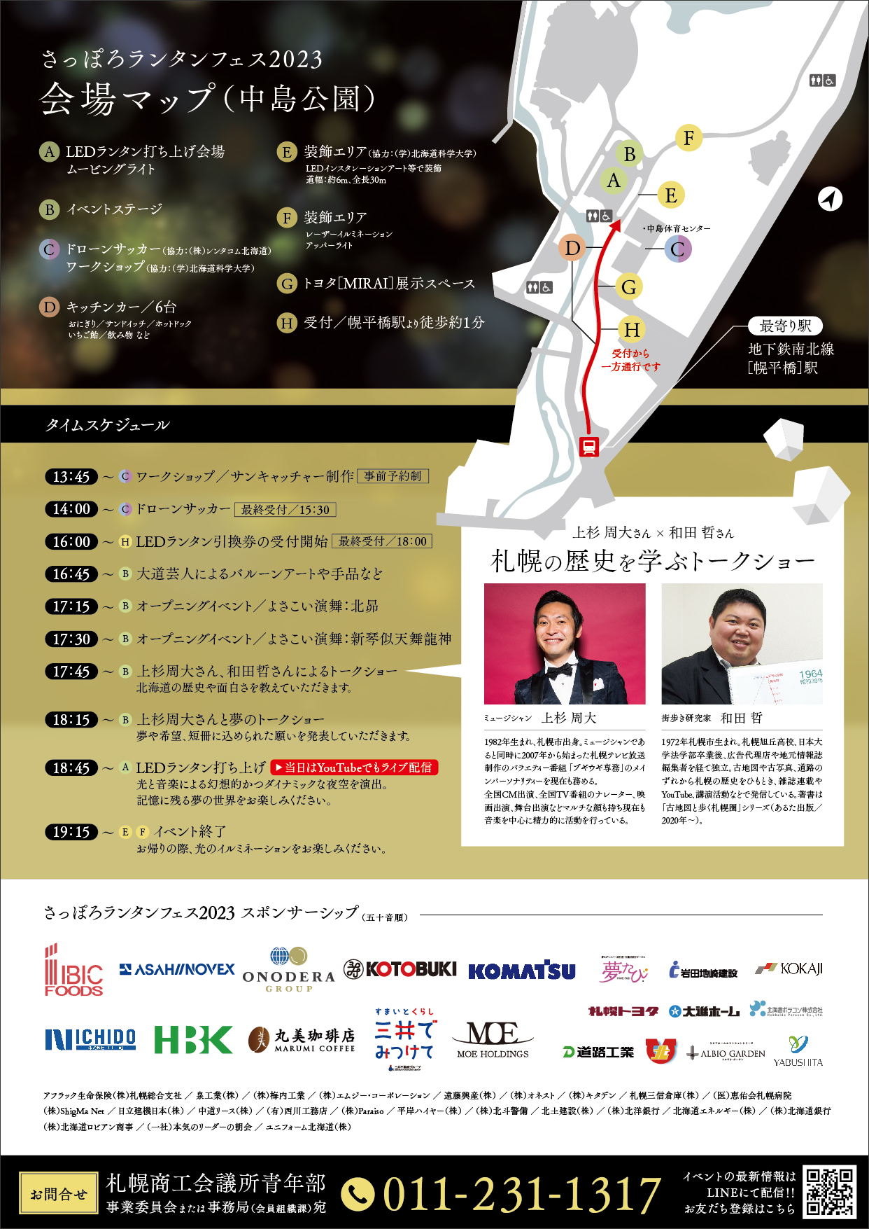 札幌の中心部に位置し、芸術・文化、自然が融合した中島公園を会場とし、願いや希望をLEDランタンと一緒に札幌の夜空へ打上げました。また、札幌の歴史に関するトークショーやドローンサッカーのイベント、キッチンカーによる食の提供、地元大学と連携したデジタルアートの制作と展示、ミライによる循環型エネルギーの利用など来場者が未来を感じ、考える事業としました。