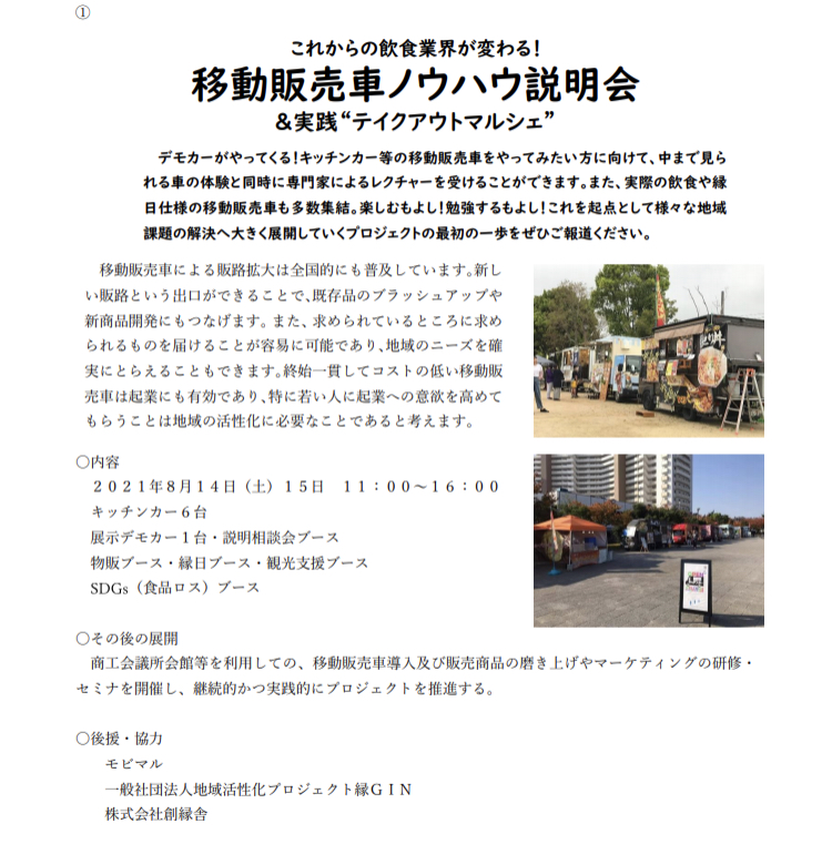 開催目的・内容:コロナ禍における新しい生活様式の中で、様々な業種の販売業態は変化せざるをえず、そのうち移動販売というかたちは大きくその数をのばしている。飲食のみならず、ほとんどの業種にとって導入可能なかたちであり、イニシャルコストのハードルも低いことで非常に注目されている。