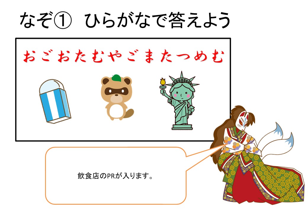 チェックポイントにはエリア内の協賛してくれるYEGメンバーの飲食店(22店舗)の店先を利用しました。これにより、ウォークラリーを楽しみながら、三島市の飲食店を知ることができます。チェックポイントになった飲食店には、謎の問題・参加解答用紙付チラシ(以下チラシ)・ポスター等を設置します。合計7か所のチェックポイントの謎を解くと、封印の呪文がわかる仕掛けになっています。謎の問題を掲示するのは7店舗ですが、その他の店舗にはヒント・情報妖怪の掲示をします。参加者がエリア内の協賛店すべての店先を極力訪れることができるように、推奨ルートをチラシ内の地図に表示します。封印の呪文をチラシ内の解答用紙に記入し、解答箱(百鬼ポスト)に投函すると、謎解きクリアとなります。最後まで謎を解いてもらい、解答を投函してもらった方には、後日抽選を行い、景品を10名に発送しました。