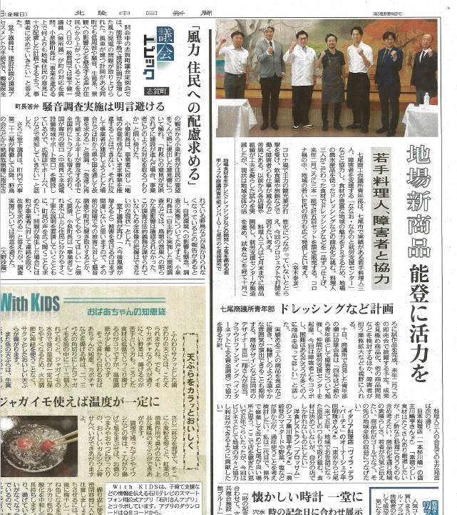 商工会議所青年部・地域の若手シェフ・障がい者支援センターが連携し、能登の食材を活用した商品開発を通じた新たなビジネスを創出します。販売にあたっては、小売店等、地域を巻き込み、Win-Win-Winの関係づくり、地域の活性化を図るとともに、食材が豊富な能登の魅力発信を行うことを目的とし本年度行っております。