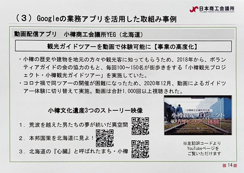 9月15日に開催された日本商工会議所 第708回常議員会・第287回議員総会にて、小樽YEGの事業が「商工会議所活動のデジタル化の成功事例」として報告されました。コロナ禍に伴い「小樽観光プロジェクト・小樽観光ガイドツアー」を動画(YouTube)によるガイドツアー体験に切り替えて実施した結果、これまでの現地参加者数(100名~150名)の10倍以上の方々に視聴体験された功績が評価されました。その効果もあり、いまは再生回数が1万回を超えております。