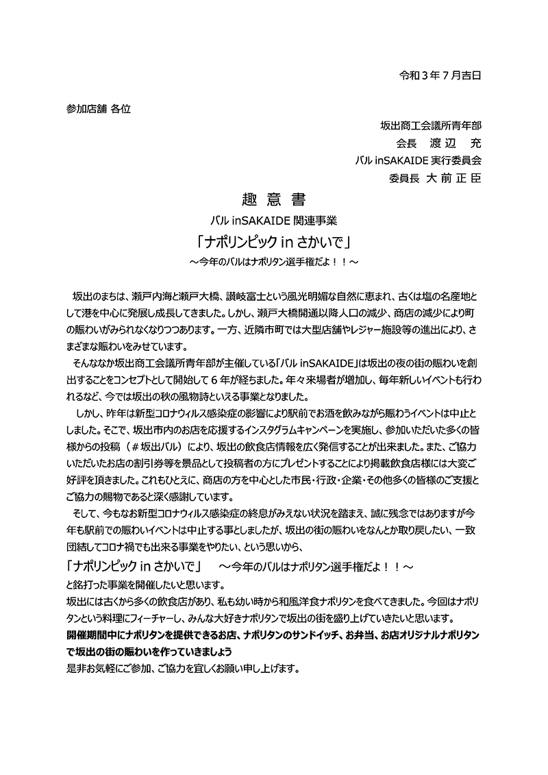 例年当青年部事業として9月に開催している駅前イベントである「バルinさかいで」がコロナの影響で2年連続で開催できないなか、同じくコロナの影響で打撃を受けている市内飲食店を盛り上げるイベントはないかと考えたのが「ナポリンピックinさかいで」です。オリンピックイヤーとなる今年とナポリタンを掛け合わせたネーミングとなっております。当事業を通じて「ナポリタンの街さかいで」のイメージを定着させ、地域の発展に寄与することを目的としています。
