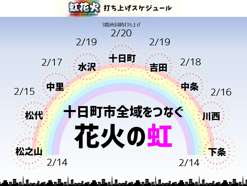 条地域:みよし台付近 15日(月)松代地域:松代総合体育館グラウンド 16日(火)川西地域:十日町市立川西中学校グラウンド 17日(水)中里地域:十日町市立中里中学校グラウンド 18日(木)中条地域:笹山球場近隣 19日(金)水沢地域:十日町市立水沢中学校グラウンド 吉田地域:南鐙坂付近20日(土)十日町地域(※3箇所同時打ち上げ): 十日町市立南中学校グラウンド十日町市立西小学校グラウンド 十日町市立東小学校グラウンド