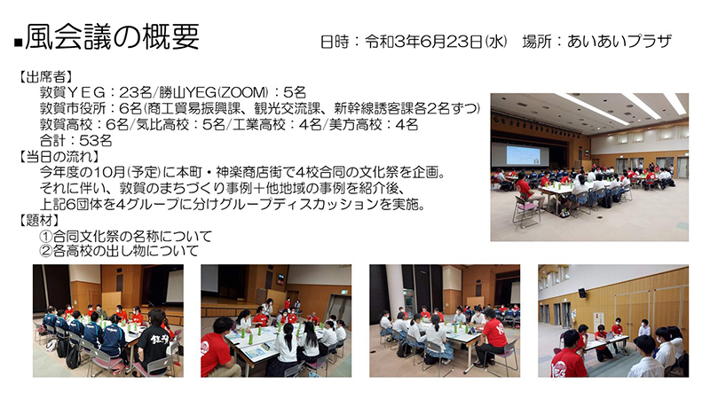 今回の事業では、企画段階から高校生に携わってもらい、地元の活性化、まちづくりを自分事として認識してもらい、将来の地域を支える担い手の発掘と育成することを目的に、文化祭の内容を検討する、YEG・敦賀市役所若手職員・高校生による「風会議」(議題は文化祭の名称・各校の出し物について)を6月23日(水)に開催いたしました。