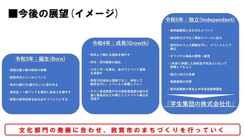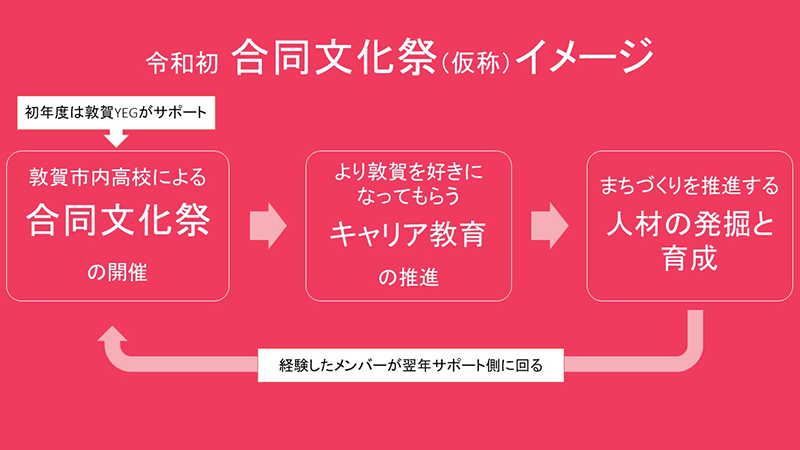 しかし、今回の「高校生合同文化祭(仮)」の主催自体は、敦賀YEGとなりますが、企画・運営を各高校の生徒たちと共に行うことで、継続性に繋げ、また、数か年計画を立て、成長性を見据えた事業にすることで、多種多様な発展に繋げていきたいと考えております。