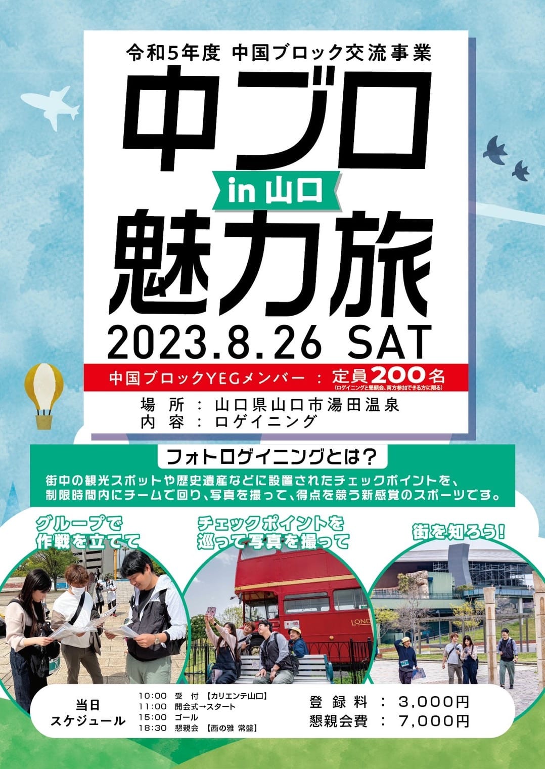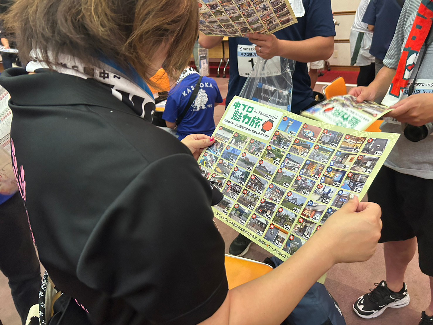 開催目的・内容:目的:西の京やまぐちの歴史や文化、街に触れながら中国ブロックの同じ志を持つ仲間 を知り、絆を深める。 内 容:1グループ5人でフォトロゲイニングの要素を取り入れた市内探訪 ・地図にあらかじめ設定されたチェックポイントを制限時間内で多く巡り獲得し た合計得点を競う。 ・チームごとに作戦を立て、チェックポイントでは見本と同じ写真を撮影し、通 過の証明に撮影した写真を用いる。 ・チェックポイントに設定された得点を獲得してより合計得点が高いチームが上 位となる。