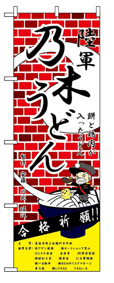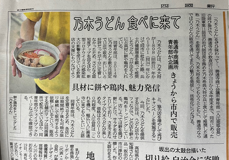 開催目的・内容:わが町善通寺の「町おこし」と「善通寺市の新たな観光資源」として乃木希典の「陸軍乃木うどん」を復活させることが目的。善通寺市内の飲食店に協力していただき全21店舗にて独自の「乃木うどん」を新たにメニュー化し食べ比べして頂くと共に、善通寺市の歴史や陸軍の歴史を体感し、乃木希典の「陸軍乃木うどん」を目当てに日本国内だけでなく世界から観光客を呼び込める切っ掛けとする。